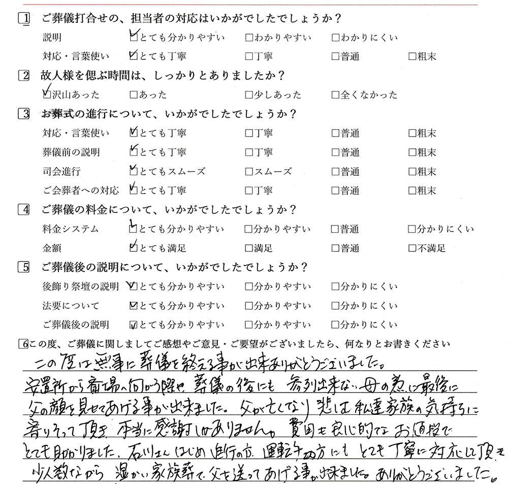 石川さんはじめ、進行の方、運転手の方にもとても丁寧に対応していただき、少人数ながら温かい家族葬で父を送ってあげることが出来ました。