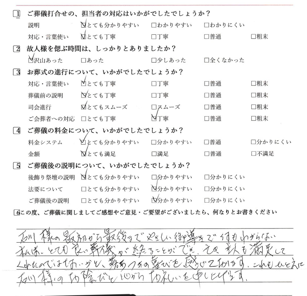 石川様の最初から最後までやさしい御導きで、何も分からない私はとても良い葬儀が終ることができ、亡き主人も満足してくれたのではないかと落ちつきの喜びを感じております。