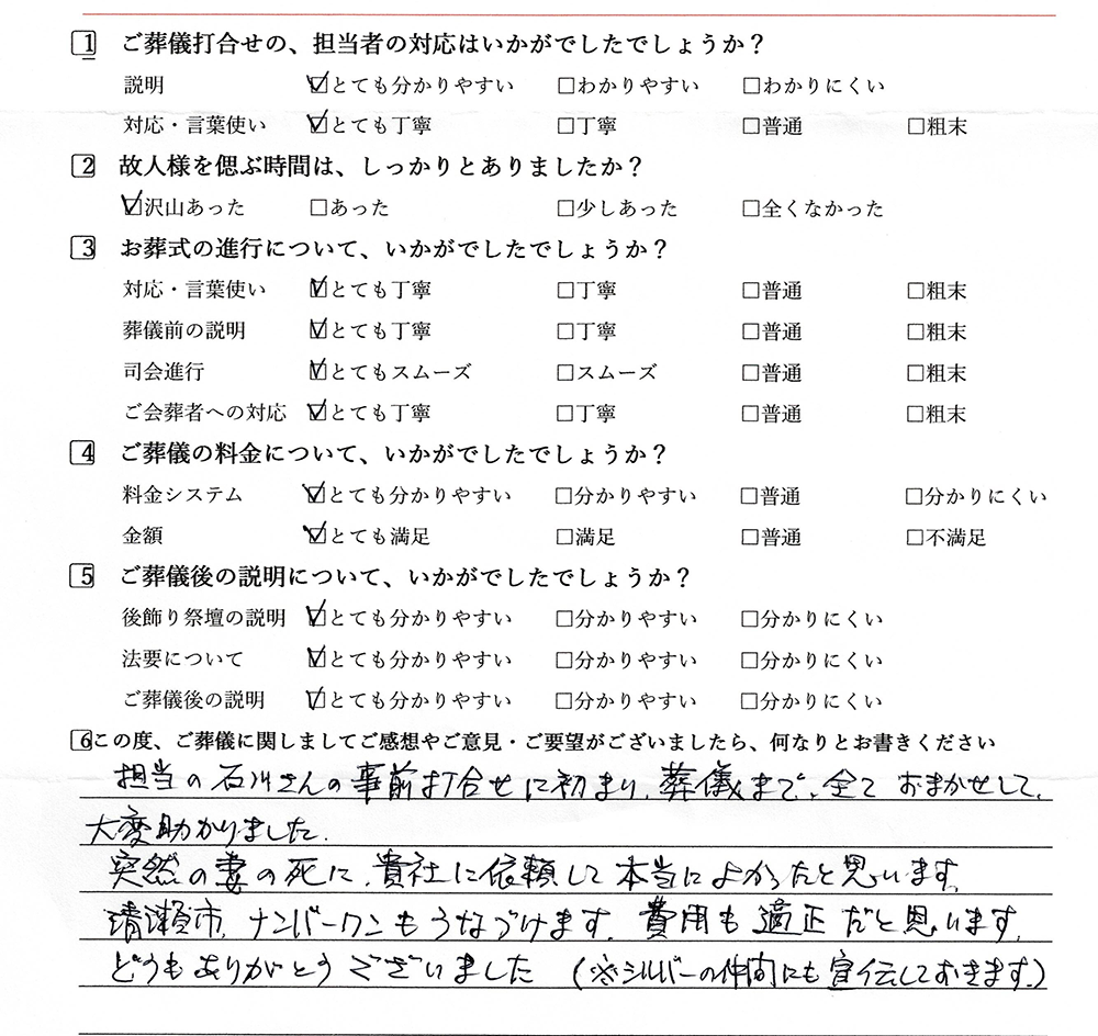 突然の妻の死に貴社に依頼して本当に良かったと思います。