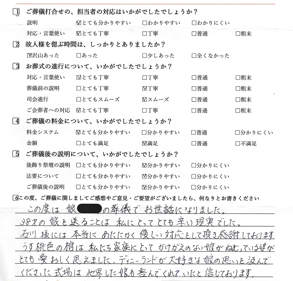 この度は、娘の葬儀でお世話になりました。