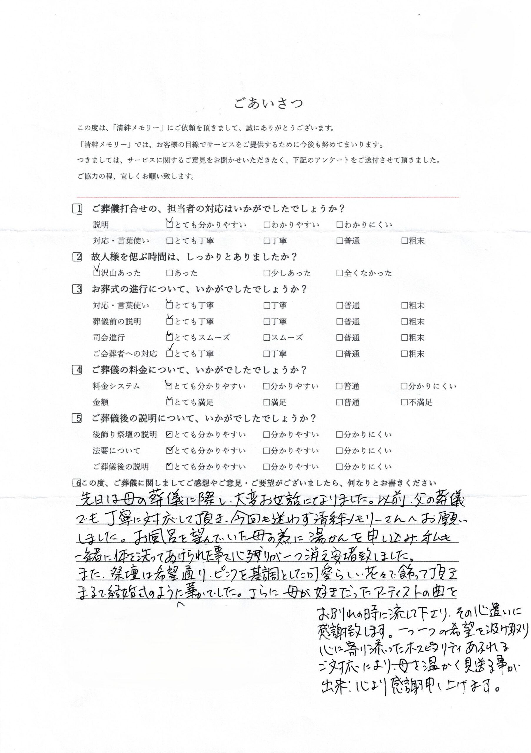 一つ一つの希望を汲み取り心に寄り添ったホスピタリティあふれるご対応により、母を温かく見送る事が出来、心より感謝申し上げます。