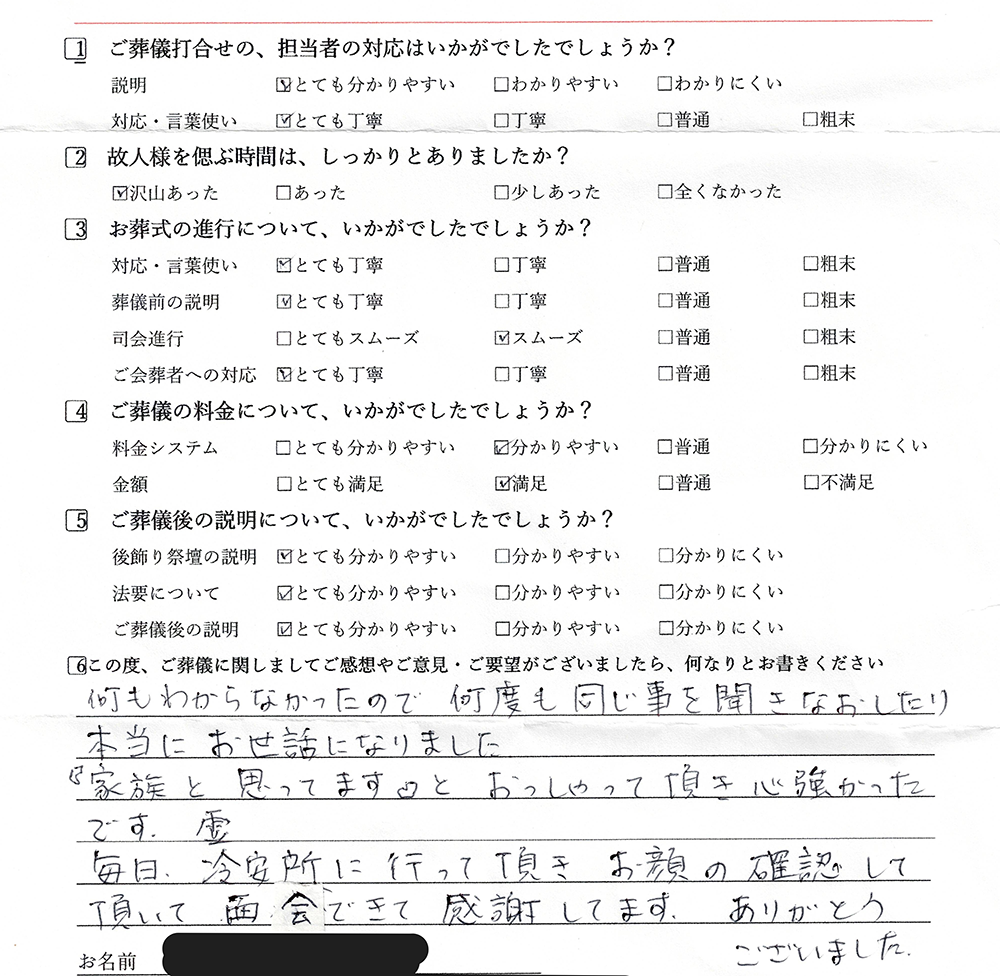 毎日、霊安所に行っていただき、お顔の確認をしていただいて、面会出来て感謝しています。